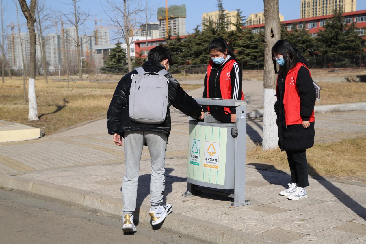 活动正式开始之前,带队队长给志愿者们讲解了此次活动的具体内容,明确校门口、日月广场、西操场、东操场、图书馆前等多个垃圾分类点,同时确定垃圾分类为可回收垃圾和不可回收两类。随后,志愿者们自行组队,分别前往垃圾分类点进行志愿服务。在活动过程中,志愿者们对丢弃垃圾的同学进行现场分类解说,通过引导同学们进行垃圾分类,并宣传有关垃圾分类的知识,从而潜移默化地树立同学们的环保意识。活动结束后,志愿者们对收集的垃圾进行分类处理。