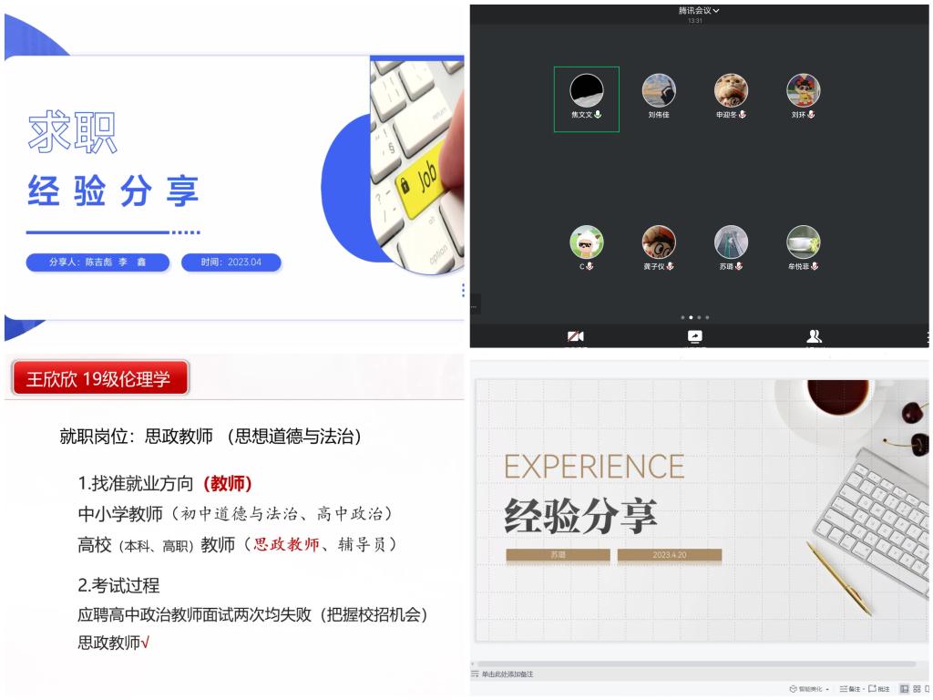 会上,2019级伦理学专业毕业生李鑫和陈吉彪(山东外国语职业技术大学,辅导员)从确定方向、着手备考、平稳心态与感悟分享四个方面一同为大家介绍了高校辅导员的上岸经验,建议师弟师妹们早日确定目标、制定计划、提前准备;2019级伦理学专业毕业生焦文文(菏泽市牡丹区实验中学,教师)结合自身备考经历向大家介绍了中小学教师岗备考的过程和注意事项;2019级伦理学专业毕业生王欣欣(烟台理工学院,思政教师)围绕就业方向、考试过程、笔试面试三个方面作了精彩分享,并就提前备课、教学设计、规范简历、个人介绍等方面进行了详细说明,鼓励同学们要平稳心态,积极备考;2019级中国哲学专业毕业生苏璐(青岛技师学院,思政教师)从就业信息获取、笔试面试备考、良好心态保持这三个方面展开讲述,使大家收获满满。分享会准备充分、内容丰富,师兄师姐耐心为大家答疑解惑,与会同学受益匪浅。
