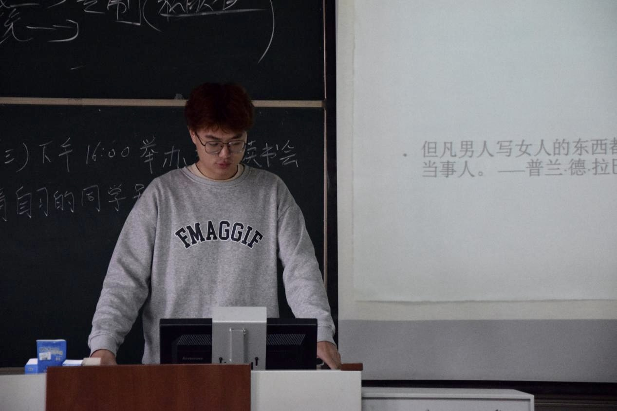 随后,2023级骆毅恒同学分享了他对⻄蒙娜·德·波伏娃《第二性》的读书心得。骆毅恒同学提出了关于此书的两个问题——“你觉得现如今男女平等吗?”以及“女性相较于男性在伦理学方面的异同之处”并加以解释,分析了当代社会对女性所存在的一些制约和障碍,引导大家用积极和发展的眼光看待两性问题,追求一种和谐的两性社会环境,携手共创美好生活。