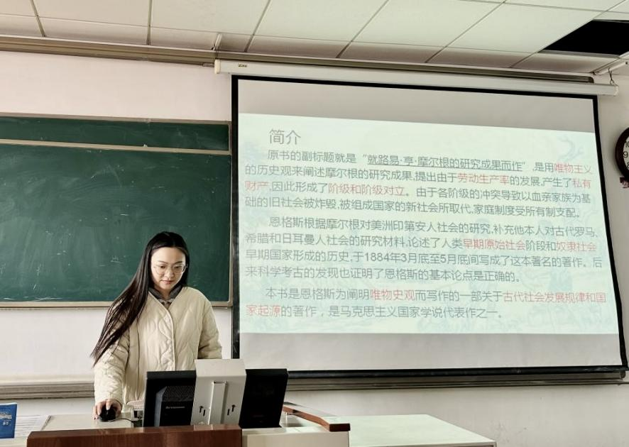 2023级宋雪晴同学从五个方面对《家庭、私有制和国家的起源》一书进行解读,她向大家提出了“从《家庭、私有制和国家的起源》看,婚姻会走向消亡吗?”这一问题,引发了同学们的讨论,并且针对此问题发表了自己的见解。