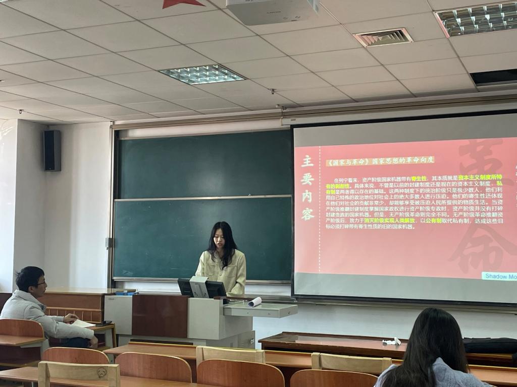 2023级孙佳琦同学结合《国家与革命》这本书与大家进行分享,这本书总结了国际无产阶级革命的经验,特别是俄国1905年革命和1917年2月革命的经验,回答了革命所面临的问题。她针对列宁提出的无产阶级专政理论对于当时的俄国以及今天的社会主义国家有何启示提出了问题并分享自己的观点。