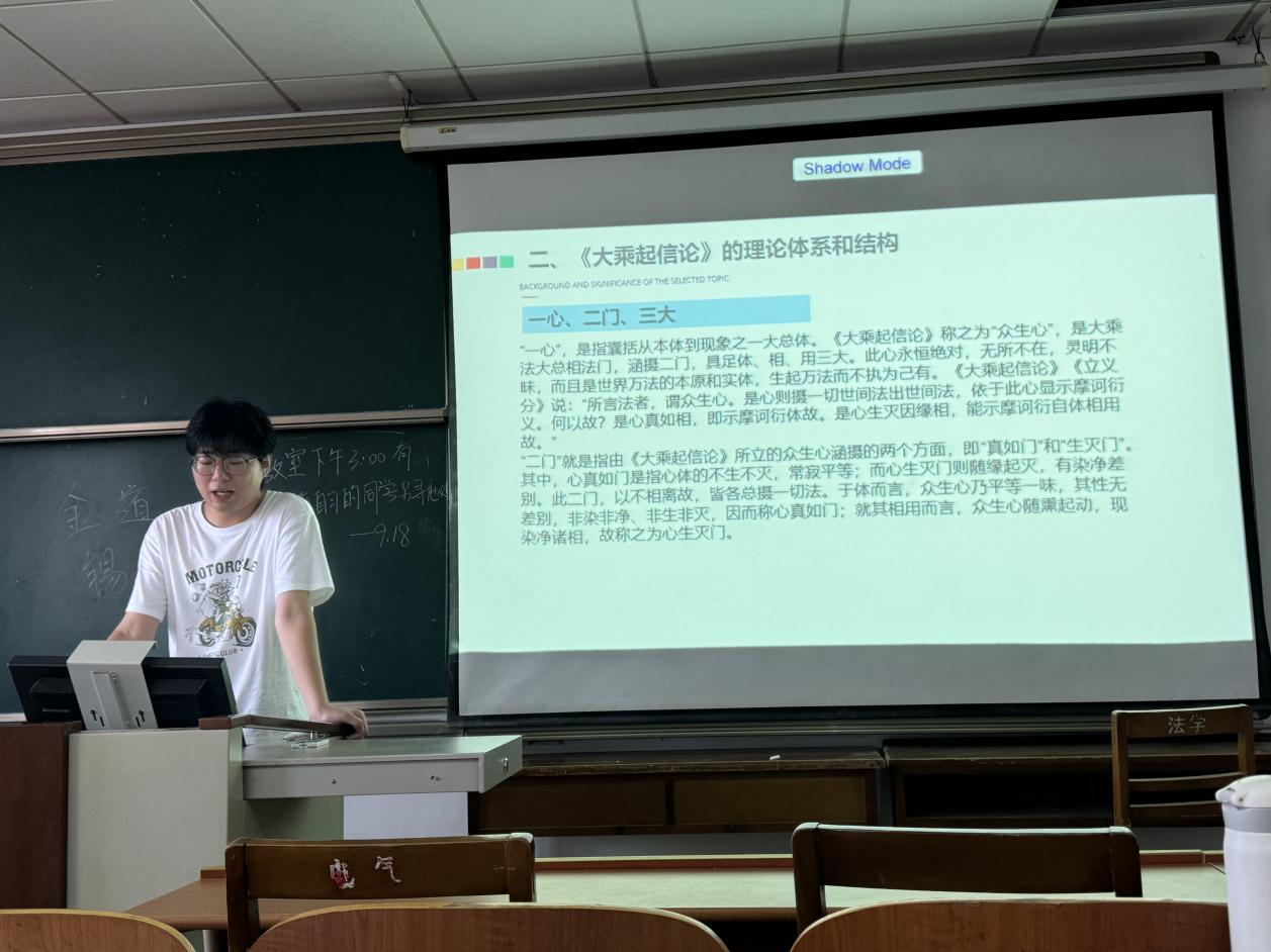 23级秦焌岚同学从真如缘起理论的角度分享《大乘起信论》一书,以一心、二门、三大为纲领,以熏习为依托,论证真如实相之可能,他指出,这一理论深刻而精当地涵摄了佛学的精华和要义,透析了宇宙人生之究竟,以明心见性为指归,教人以离苦得乐为要义。