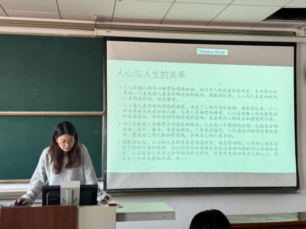 2023级王昱婷同学分享了《人心与人生》一书,主要介绍了书中所谈到的人心与人生的关系问题,指出人心与人生的关系是相互依存、相互影响的。人在追求人生意义和幸福感的过程中,需要开发和培育自己的人心。最后,她根据自己的理解提出了对于人性的思考和其中哲学观的理解,引发了同学们的讨论与思考。