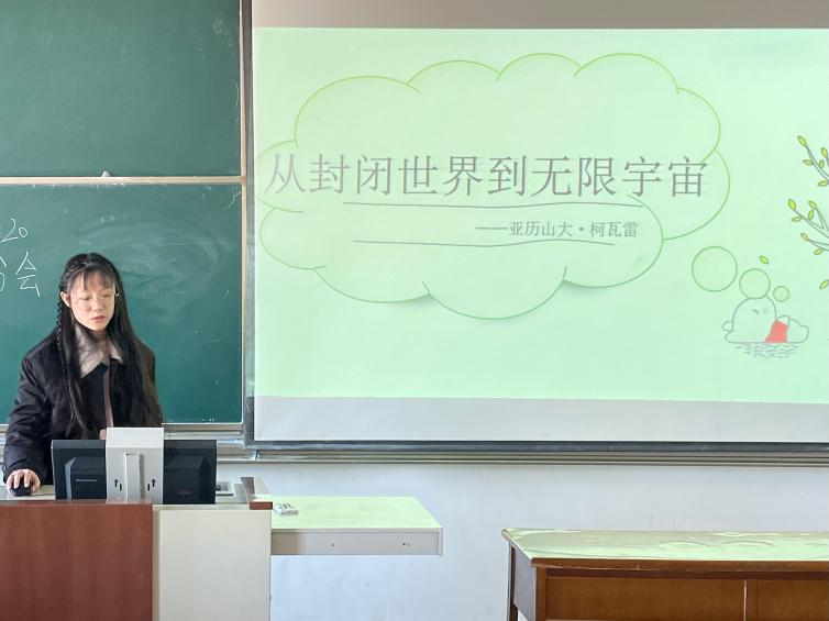 2024级舒萍萍同学分享的是《从封闭世界到无限宇宙》,她围绕柯瓦雷所关注的十六、十七世纪的科学和哲学思想,简要概括了这一时期人类思想所经历并完成的深刻的革命,即和谐整体宇宙的解体和空间的几何化。同时,以自身的理解阐释了宇宙究竟是有限还是无限的哲学问题。