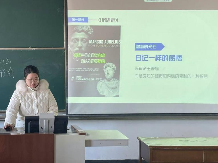 2024级姬晓雯同学分享的是《沉思录》,她介绍了作者对身羁宫廷和自身所处混乱世界的感受,阐述了书中灵魂与死亡的关系,解析了个人的德行、个人的解脱以及个人对社会的责任,向大家提出了“智慧的总结与经验的提炼有几种精神哲学”的问题,引发了同学们的深入思考。