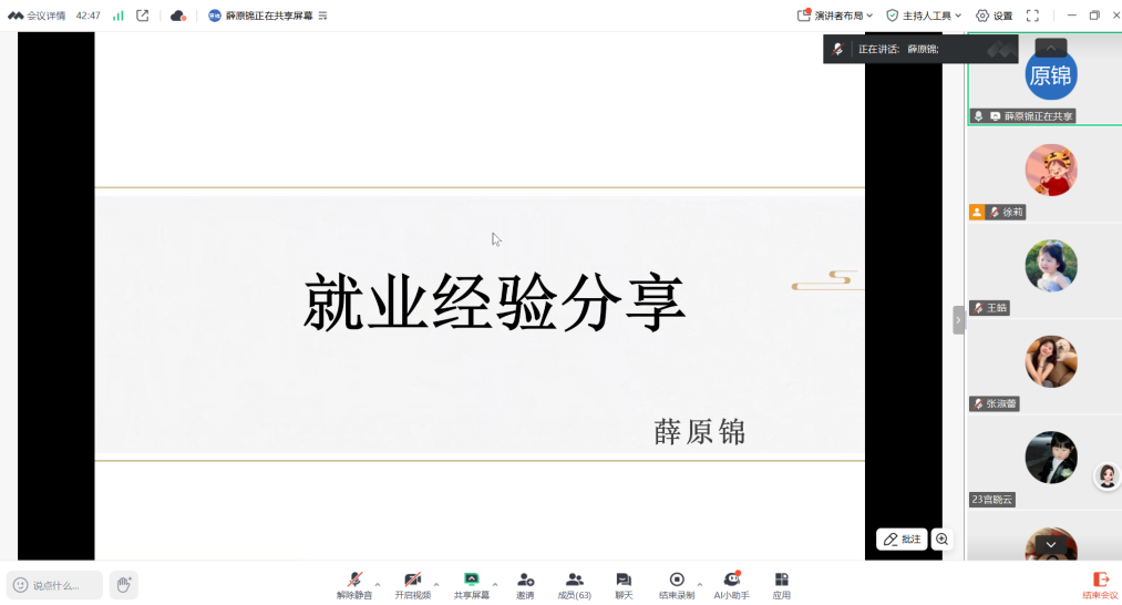 于4月18日和4月24日召开优秀硕士毕业生求职升学经验分享会,会议邀请龚子仪、薛原锦、陈晨等7位2024届硕士毕业生围绕考博、考公、考编等就业类型分享个人经验,会议由研究生辅导员徐莉主持,51视频