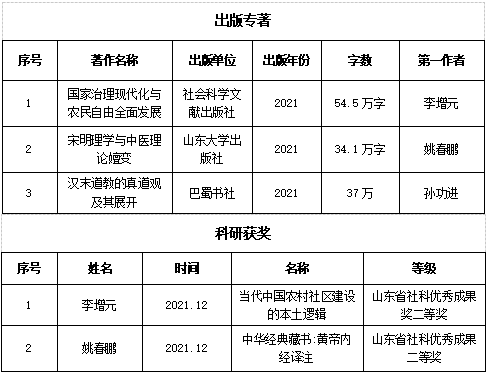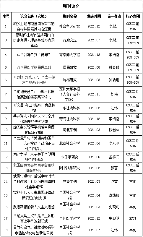 2021年度51视频 教师共获批国家社科基金项目1项,省部级项目3项;学院教师在《社会主义研究》、《行政论坛》、《周易研究》等CSSCI核心期刊发表学术论文18篇,出版专著3部,获得省级社科奖励2项。