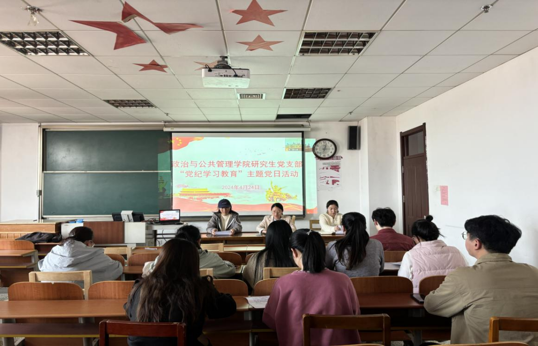 研究生党支部于JC603教室开展党纪学习教育主题党日活动,活动由党支部书记徐莉主持,支部全体党员参加。