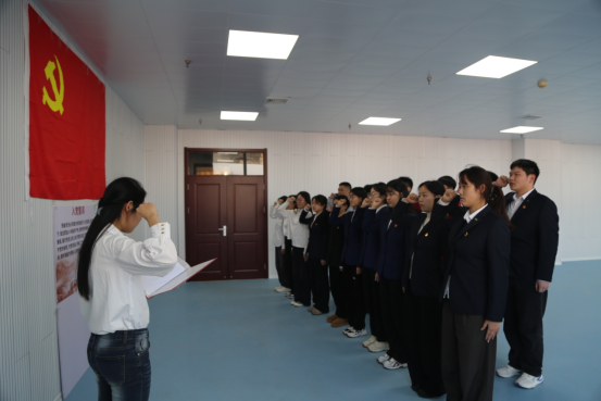 仪式现场庄重肃穆,全体预备党员身着正装,面向鲜红的中国共产党党旗,整齐列队、举起右拳,以铿锵有力的声音庄严宣誓。誓言铿锵,初心如磐,充分展现了新党员为共产主义事业奋斗终生的坚定信念与决心。