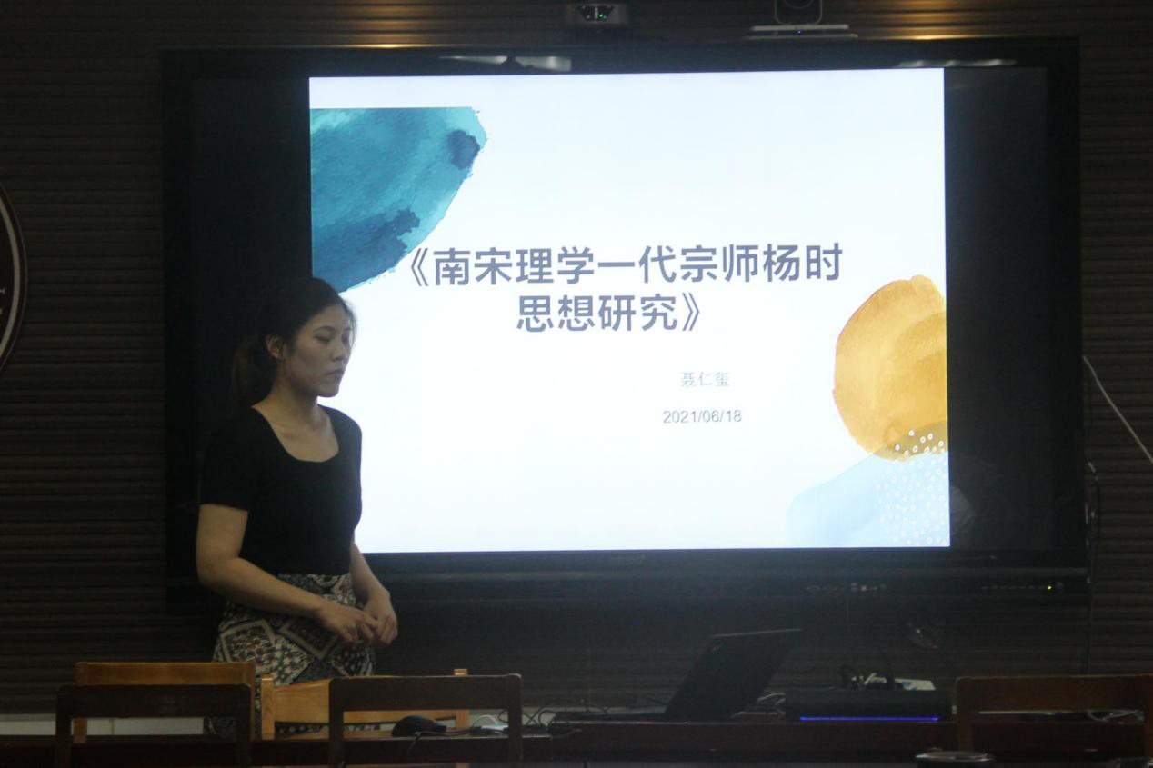 首先,2020级聂仁玺同学为大家分享了《南宋理学一代宗师杨时思想研究》一书,她首先介绍了龟山家世与生平事迹,随后,又向大家详细介绍了道统论、天理论、“格物致知”的认识论、人性论、安邦治国的政治思想、富有特色的教育思想和寓理于诗文、温厚自然的文学成就。