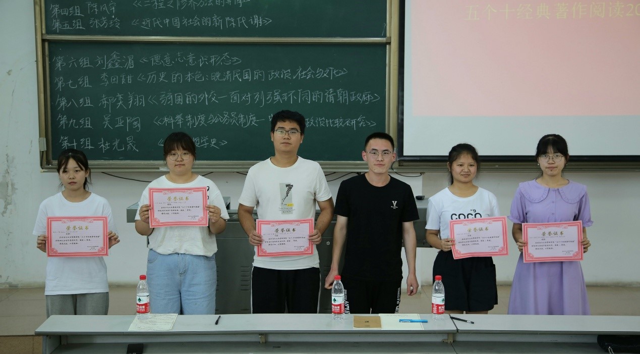 比赛结束之际,依据各位评委老师打分情况,最终,第六组、第九组荣获一等奖;第八组、第二组、第十组获得二等奖;第四组、第一组、第七组、第五组、第三组获得三等奖,在场评委与各小组合影留念,此次2019级经典著作评比活动圆满结束。