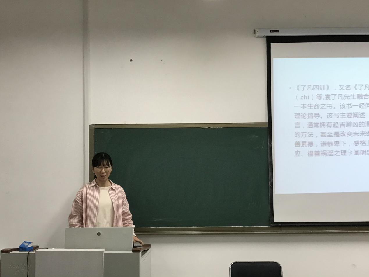 2020级鲁洋同学分享了关于《了凡四训》中“改过之法”的探讨。首先对作者和本书内容做了简要介绍。其次,说明了“改过之法”的三个层次:其一,从事上改者,即针对所犯过错的这件事情本身;其二,从理上改者,即以所犯过错中所蕴含的道理为对象;其三,从心上改者,即指向于使人产生过错的内心。这三个层次并不是并列的,难度和重要性也不相同,最为根本也是难度最大的,就是“治心”以改之,次之,就是“明理”以遣之,最后,则是“随事”以禁之最后,提出了对于“改过之法”的建议,一是要建立奖罚机制,引发社会认同。在起初的他律阶段,要建立好奖罚机制,扬善抑恶,在社会范围内营造一种社会认同和社会氛围;二是要提升道德认知,通过现象看本质。应该加强对人生哲学问题的思考和教育,让人们能够看待问题的时候站在更高层次,不断丰富和完善自己的人生。