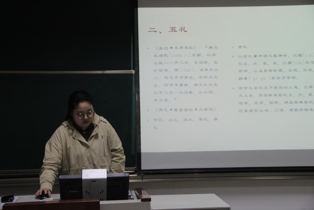 本期政研论坛读书交流会围绕伦理学相关专业书目及人物思想展开讨论。2019级李道涵为同学们分享了《礼记》。对五礼及六礼七教八政的基本内容做了讲解。《礼记》较为完整地反映了先秦至两汉时期的社会政治文化背景和家庭结构状况,形成了独具特色的家庭伦理规范,指导着当代伦理道德。