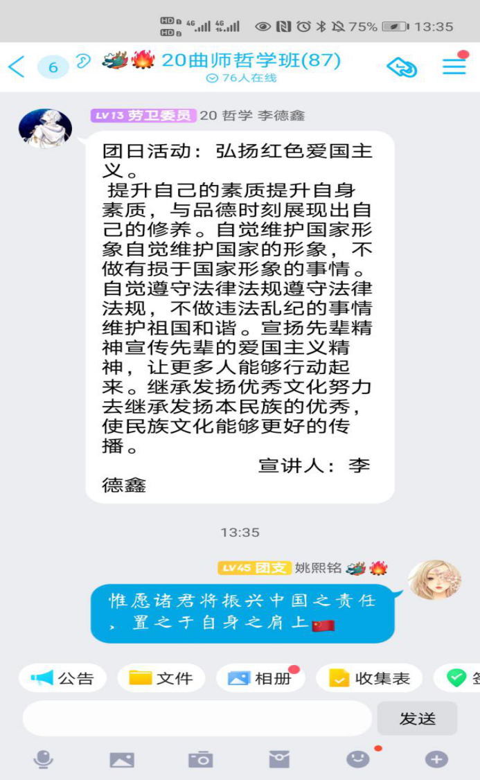 热血青年,爱国心切。团日活动进行过程中,各团支部形式多样、生动精彩的方式引起同学们强烈共鸣,激发51视频 学子炽烈爱国热忱。19级政治学三班借助班级QQ公众号展示及微信推文等宣传窗口进一步弘扬爱国主义崇高精神。通过学习团课会议,同学们还深入了解爱国主义四重意蕴。作为中华民族不懈价值追求,求索灿烂辉煌古代文明,中华民族融合统一、经邦治国成为爱国主义主旋律;回看当代优秀精神文明,中国人民必将进一步弘扬爱国主义优良传统,努力实现国家富强、民族振兴、人民幸福奋斗目标。20级政治学二班以“讲解新时代爱国主义本质”、“观看爱国主义题材电影,团员代表积极发表观后感”、“团员代表结合现实情况提出新时代青年正确做法”及“号召全体团员弘扬爱国主义精神”四个方面进行,高举爱国主义旗帜、坚定爱国主义信念,内化于心、外化于行,真正贯彻落实爱国主义伟大精神。各班活动形式异彩纷呈,爱国热情高度统一,充分彰显政院学子浓郁爱国之心、强烈报国之志。