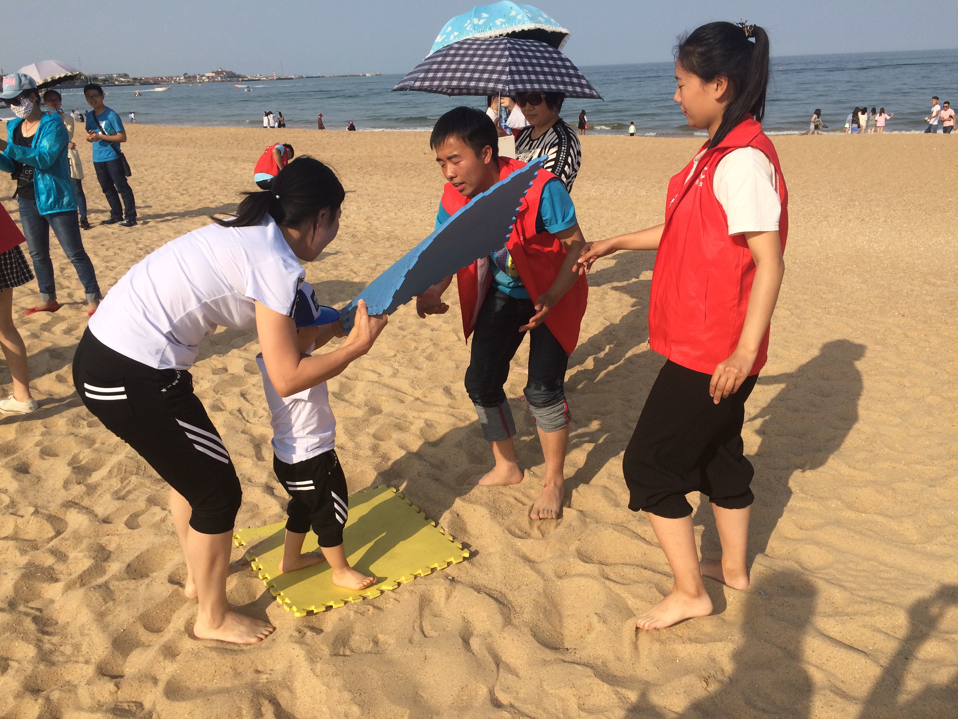 中午,曲师义工赶往太公岛沙滩,为“七彩梦”孩子们布置“六一”亲子趣味运动会场地。在游戏中义工们积极配合家长,辅助孩子们完成击鼓传球、搭桥过河、撕名牌、沙中淘宝等比赛项目。活动中穿插着孩子们、义工们的精彩节目表演,现场加油呐喊声不断,引得不少游客驻足观看。本次七彩梦活动,通过不同形式的锻炼项目,进一步提高了自闭症儿童的感知沟通能力和竞争意识,增强了融入社会的能力。