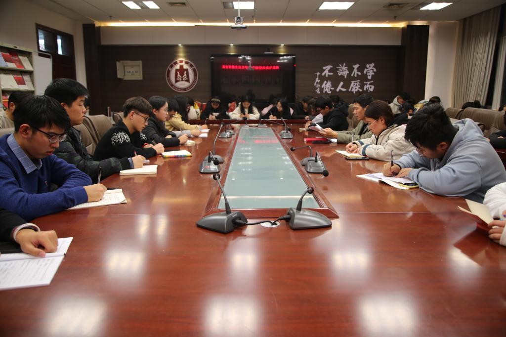 团委在JC909组织开展党的十九届四中全会内容学习会。本次会议由院团委书记王元如主持,院团委委员、学生会主席团成员、各团支部委员和部分学生会干部参与。