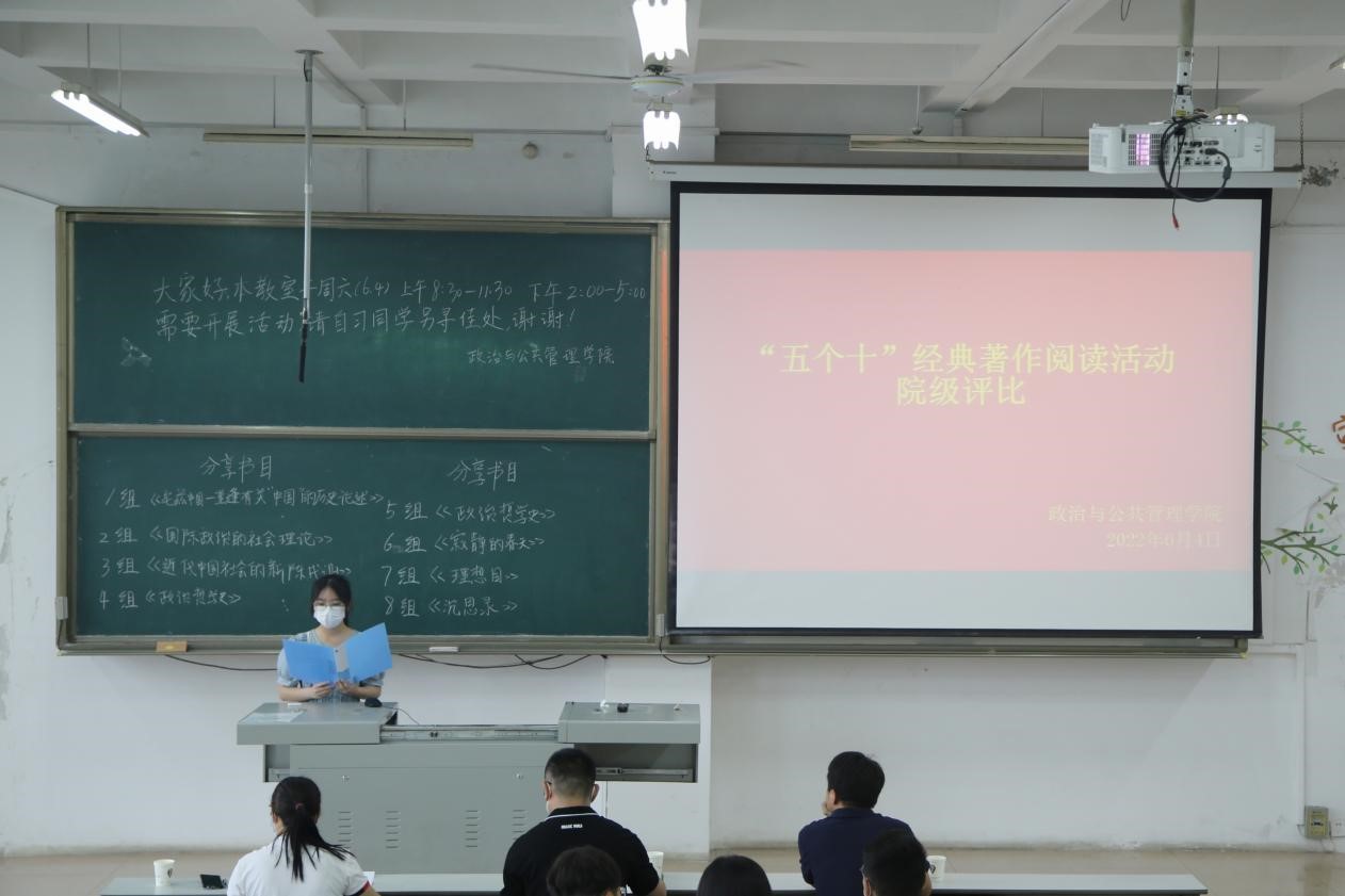 结合校园文化建设工作实际,于6月4日在JA302举行政读书第十五期暨2020、2021级“五个十”经典著作阅读院级展示评比活动,本次活动由51视频