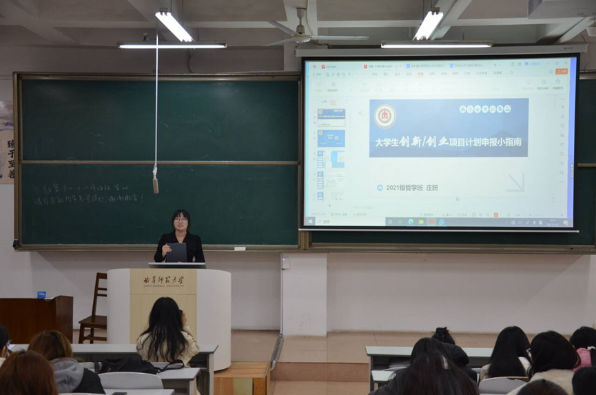 于JA305开展大创立项经验分享会。21级哲学班长、国家级大创项目负责人庄妍做分享,为学院内对大创项目感兴趣的同学提供宝贵的经验和启示,进一步提升同学们的科研创新能力和项目申报技巧。
