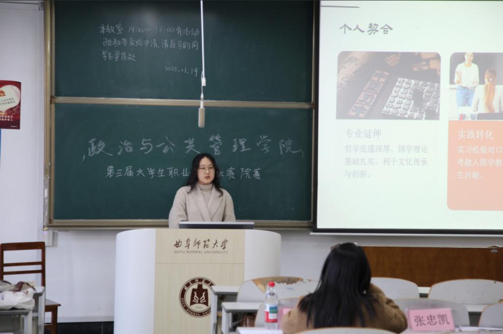 本次赛事设置成长赛道与就业赛道两大竞赛方向,覆盖不同年级学生职业发展需求。参赛选手结合自身性格特质、专业基础与发展愿景,锚定公务员、高校教师、公共部门管理岗等目标职业,尤其聚焦基层治理、公共服务等领域的实践价值与发展空间,通过 PPT 展示、现场答辩等形式,系统呈现职业规划的逻辑框架、实施路径与预期目标,充分展现了政管学子对职业发展的深入思考与责任担当。