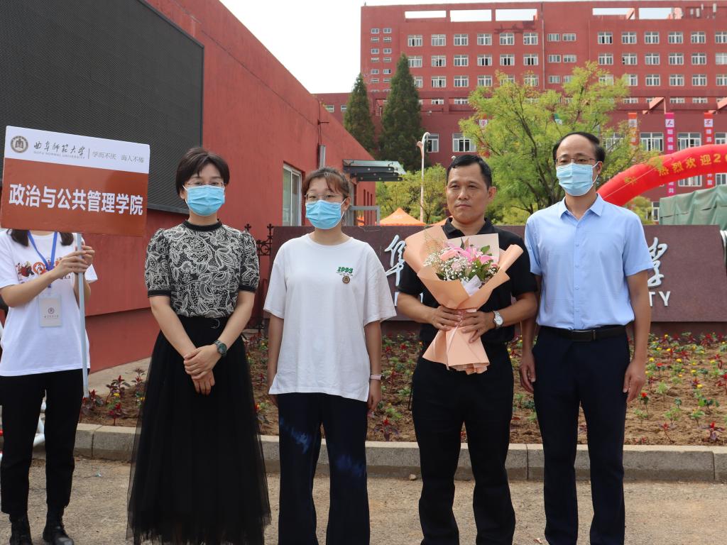 2003级研究生校友秦茂森。了解到这段不解之缘,学院在学校北门接站处为他们准备了一场特殊的“报到仪式”,党委书记卢瑞霞书记为新生赠送鲜花,副院长李增元为父女二人佩戴校徽,并共同合影留念。