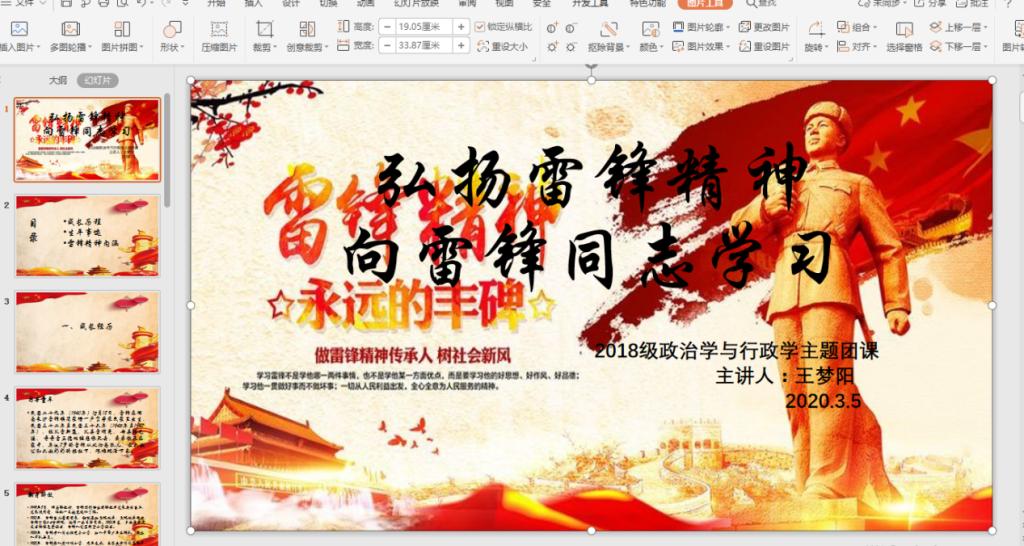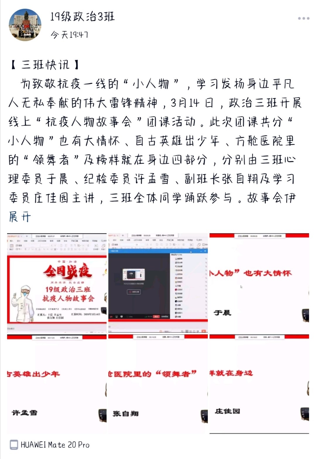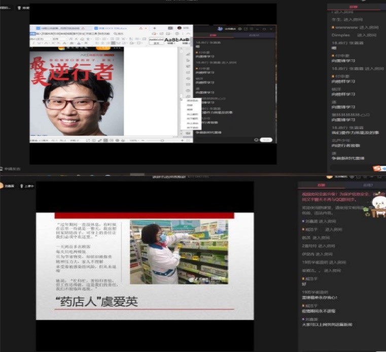 在此次活动中,19级哲学班团支部通过鼓励大家了解在疫情期间涌现的“小人物”,以宿舍为基础分成小组,每个小组制作几张介绍一位“小人物”或某个默默奉献的群体的故事的PPT,利用QQ群课堂等方式,进行线上讨论,来学习他们身上的志愿服务精神。与此同时,18级政治学与行政学班、19级政治一班、19级政治二班团支部则通过转发热点新闻、制作ppt、录制视频等形式开展线上分享会,引导支部成员去发现疫情期间“小人物”的身上所体现出来的奉献精神,挖掘雷锋精神在当下生活中的体现。
