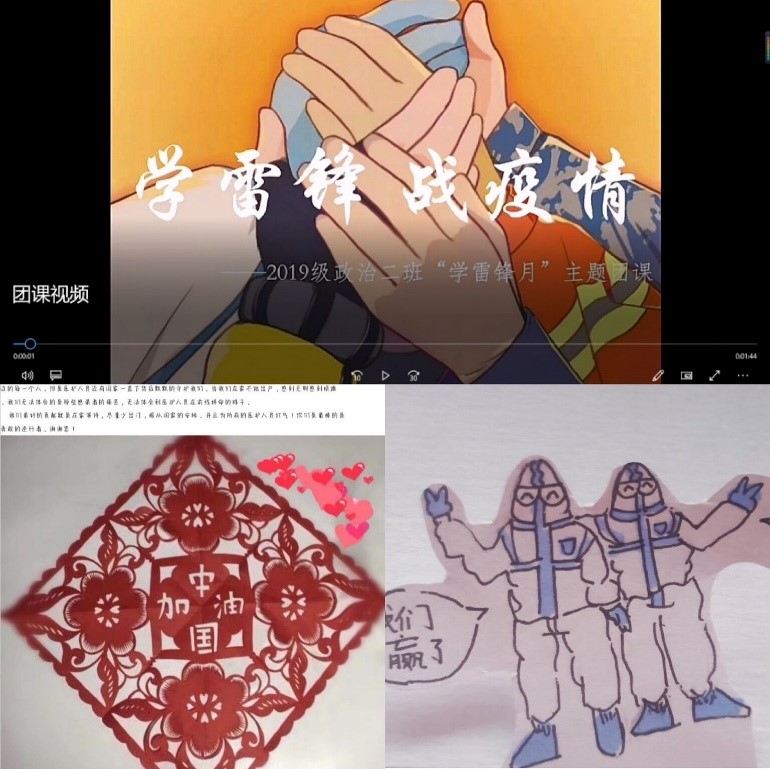 2018级、2019级各班围绕“致敬最美逆行者”主题向各团支部成员征集优秀绘画、征文、剪纸作品,并通过相关微信公众号加以宣传,其中,2018级哲学班团支部组织支部成员学习从“逆行者”们身上体现的新时代的雷锋精神;政治学三个团支部分别以优秀绘画、优秀剪纸、优秀征文为侧重点,表达对抗击疫情人员的敬意;2019级各个班级则通过短诗写作、抗击疫情视频制作等方式表达对一线人员的祝福。各个团支部有序组织,活动内容丰富,宣传效果显著。