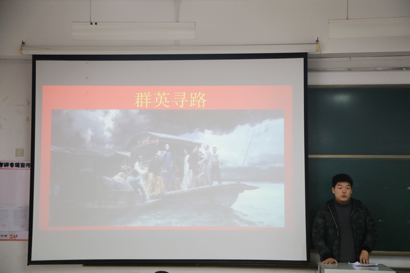随后,弘道宣讲团成员围绕“中国梦”、“中国道路”、“不忘初心,牢记使命”三个关键词展开演讲,讲述建党98年来中国共产党的风雨发展历程。王星普以“群英寻路”为主题,详细叙述了毛泽东、李大钊、陈独秀等优秀共产党员怀揣初心、探索中国救亡之路的故事,高度赞扬了中国共产党人敢于斗争、不畏艰险的爱国热情。范晓萌以新中国开国盛典为例,引出中华人民共和国成立前共产党人为新中国成立作出努力与牺牲的英勇事迹,表达对中国共产党人的敬佩与怀念之情。邵莹雪围绕奋斗精神,讲述了建党 98年来中国共产党不变的奋斗热情,强调只有不忘初心、牢记使命,永远奋斗,才能让中国共产党永远年轻、永远生机勃勃。