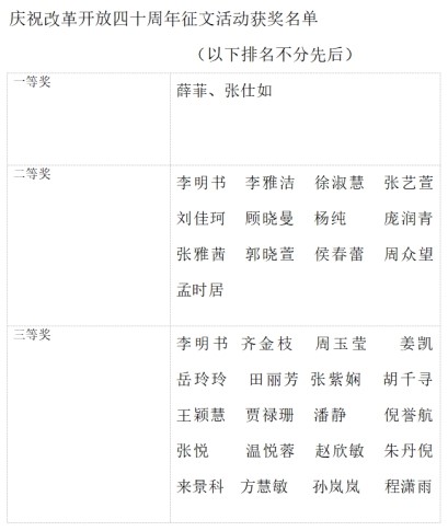 积极组织,学生踊跃参加,共有220篇征文提交学校。经过学校评审,薛菲、张仕如2人荣获一等奖,李明书、李雅洁等13名同学荣获二等奖,齐金枝、周玉莹等20名同学获得三等奖,他们在本次征文活动中真情流入、有感而发,其他参赛同学同样笔下生花。所有参赛者都将自己心中的曲园复兴与对改革开放的展望描绘尽致。