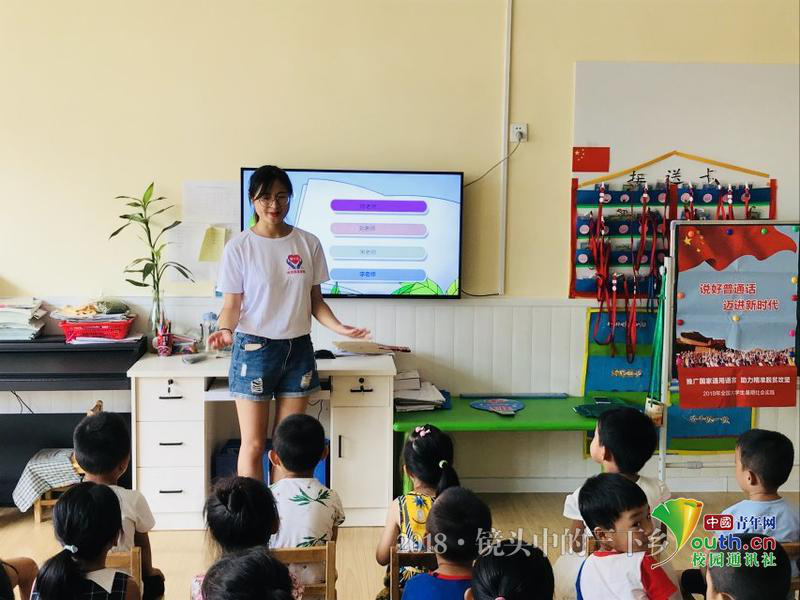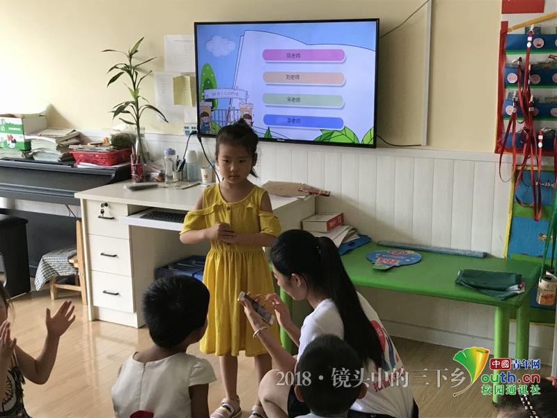 “鹅鹅鹅,曲项向天歌,白毛浮绿水,红掌拨清波。”整齐的背诵声从屋里传来,实践队员走进中班教室和小朋友们初次见面。为了不打扰孩子们背诵,实践队员绕到教室后面,仔细聆听孩子们背诵。“小朋友们背的很齐,这时候他们的发音尚未定型,现在教他们学普通话很是时候。”一位队员说道。