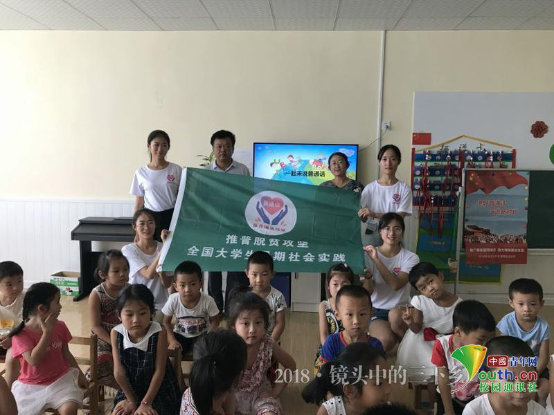 2018暑期三下乡“推普脱贫攻坚”全国大学生暑期社会实践专项队伍“政当时”部分队员抵达潍坊市昌乐县朱刘街道万山幼儿园,开始了与万山幼儿园中班的孩子们的推普小课堂。
