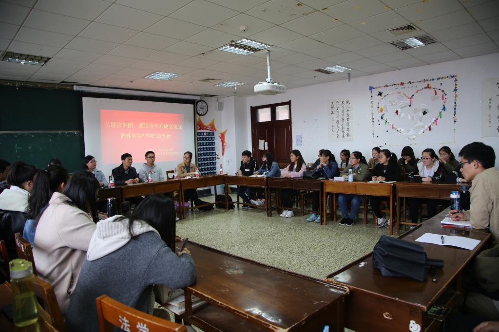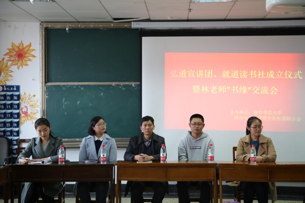 弘道宣讲团、就道读书社成立仪式暨林老师“书缘”交流会于JC605举行。团委书记王元如、哲学系主任林祥磊、辅导员武莉华应邀出席,部分社团成员参加,本次大会由社联主席张潇天主持。