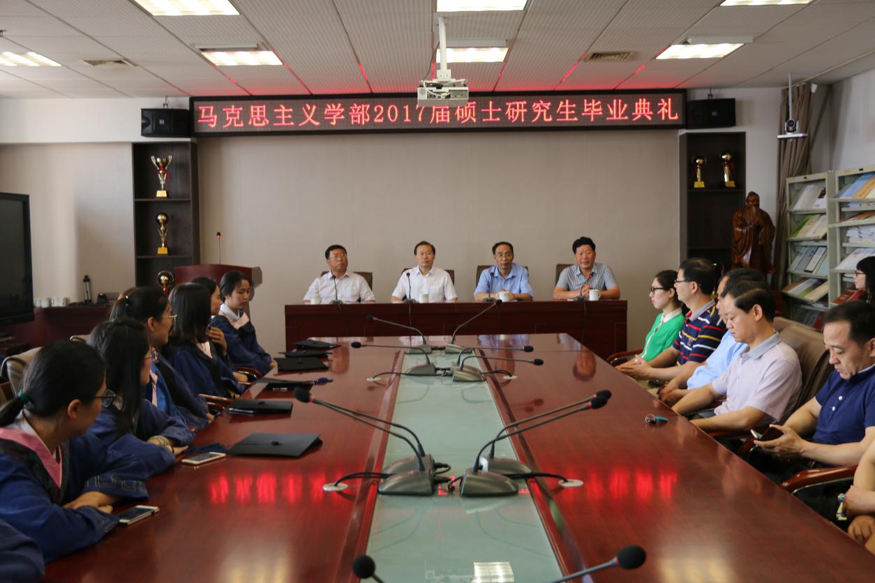 院长王维先教授代表学部领导和全体师生发表了热情洋溢的致辞,他对同学们刻苦学习、顺利毕业,表示热烈的祝贺,对全体导师的付出表示崇高的敬意和衷心感谢。面对即将离校的同学们,王维先教授提出了四点希望:坚定理想信念,志存高远;加强学习,勇于实践;勇于负责,敢于担当;健康向上,砥砺品格。王院长嘱咐全体毕业生关注并支持母校的发展,与母校保持联系。导师代表铁省林教授在致辞中也对毕业研究生提出了殷切的期望。毕业生代表杨伟荣在发言中包含深情地感谢母校、感谢马克思主义学部、感谢恩师谆谆教诲、感谢同学一路相伴,一定以优异成绩回报母校和老师。在校生代表高甲杰在发言中祝贺师兄师姐圆满完成学业,感谢师兄师姐对师弟师妹的引领,表示一定努力学习,为学部争光。