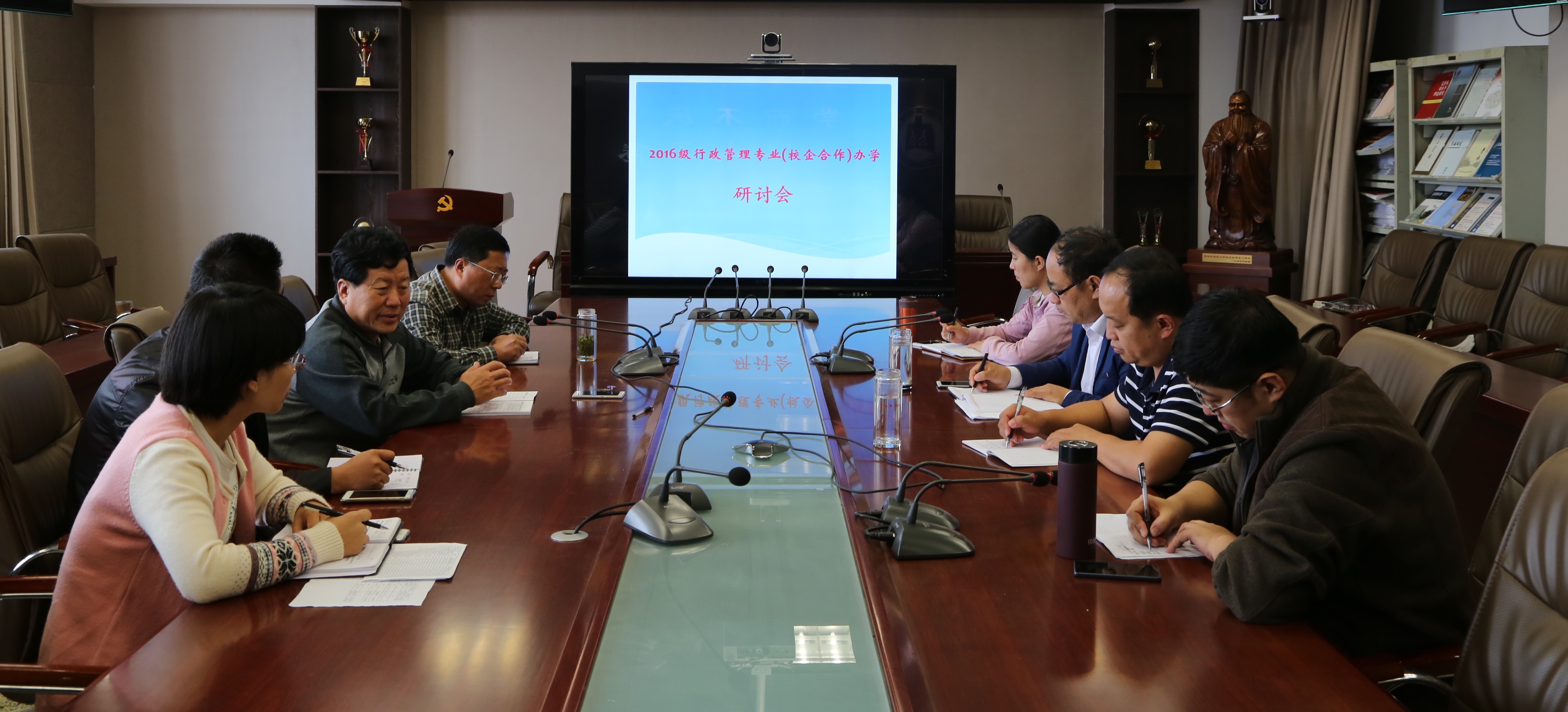 在JC909会议室召开2016级行政管理专业(校企合作)办学研讨会,学部党委书记张立兴、政治学院院长王维先、学部党委副书记刘进、院长助理林士俊、行政管理系主任徐自强、辅导员陈敏、企业方代表许彩云、卜祥龙参加,会议由张立兴主持。
