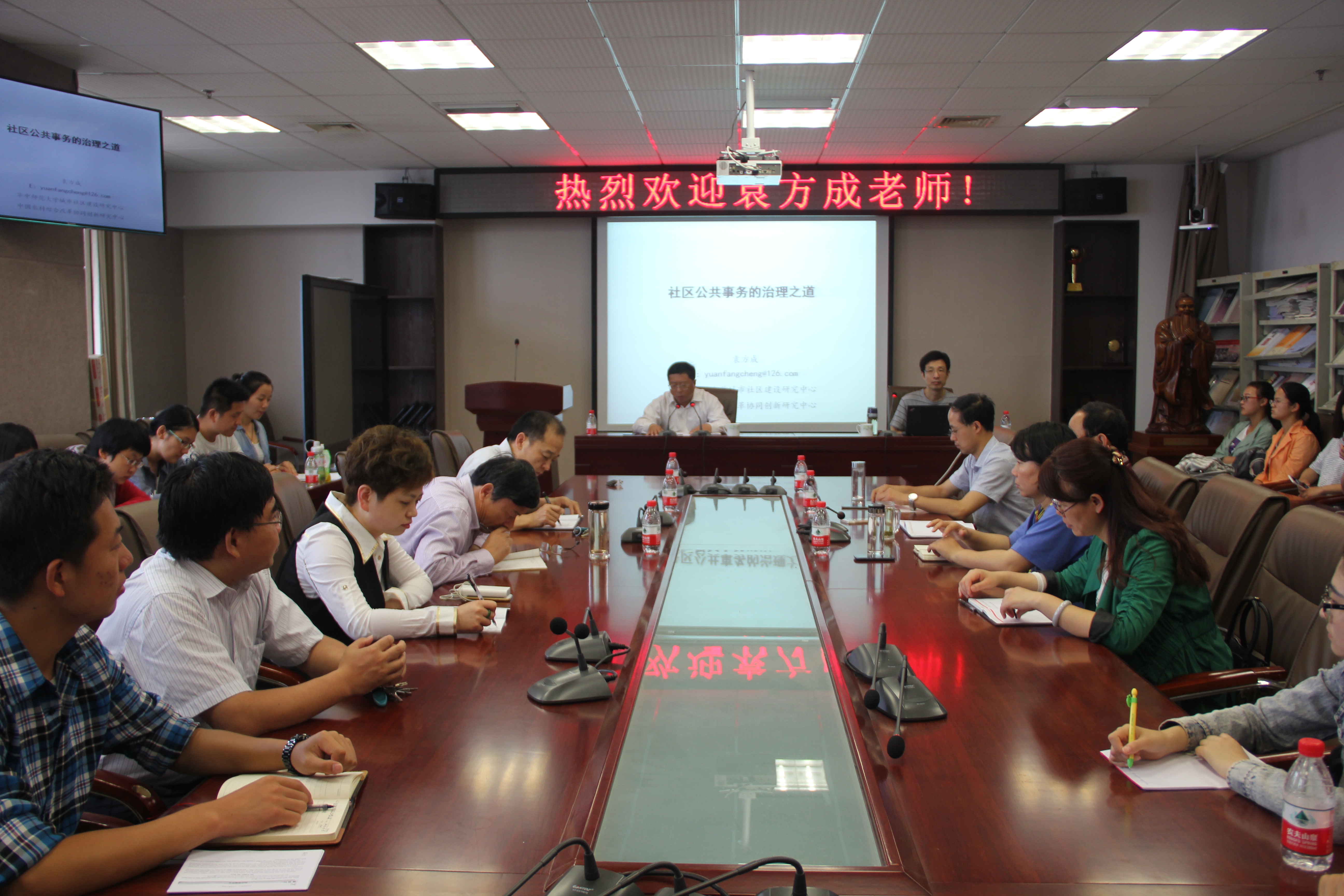 讲座伊始,袁教授以社区卫生治理为切入点,揭示传统行政思维方式的局限性,从而引出建立长效治理机制的必要性。随后,袁教授通过剖析楼道卫生治理与助老服务的案例,探讨社区公共建设的新思路、新需求与新思路。对于楼道卫生治理方面,他主张利用需求调查、风险评估、签署自策公约等方式,通过发展目标领袖和充分开发社会资源,提升社区社会工作能力和可持续发展能力。而在助老服务方面,他突破传统体制养老的局限性,主张通过落实“健康知识讲座”等措施,建立社区自治联盟,提升养老服务品质。会末,袁教授与师生进行探讨,为同学们解答社会公共服务与养老服务等方面的问题。王维先教授总结会议,肯定袁教授在社会公共治理方面的专业知识素养以及理论联系实际的工作方法,激励师生们培养不断探索的优良品质。