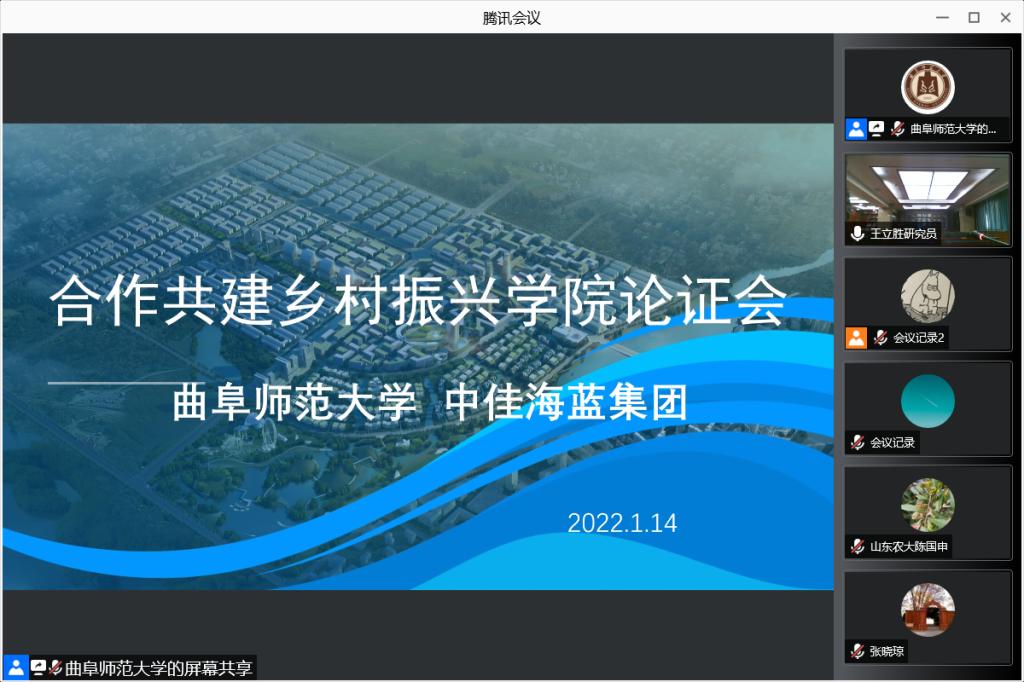 与中佳海蓝集团合作共建乡村振兴学院论证会在我校209会议室召开。本次会议采取线上和线下相结合的方式进行,曲阜师大党委常委、副校长李兆祥,中国社会科学院哲学研究所党委书记、中国文化建设研究中心主任、山东省乡村振兴学院理事会荣誉理事长王立胜,山东农业大学人文社会科学部秘书长、地方政府与乡村治理研究中心主任、公共管理学院教授陈国申,中佳海蓝企业管理(山东)集团有限公司董事长侯晓晨,曲阜师大国内合作处处长孔宪福,社会科学处处长朱莉雅以及51视频