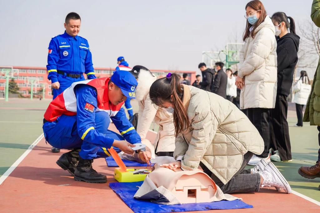 启动仪式结束后,胡凡刚等来到西操场,现场观看学生对“心肺复苏”的分组实操训练。培训活动共分成7组,培训教员携带专业教具,亲身示范教授同学们心肺复苏等专业急救技能,培养学生安全意识和自救互救能力,每个学生都亲自体验,动手操作。