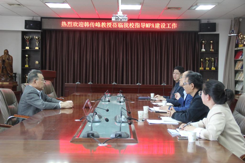 MPA的教育发展情况以及建设过程中面临的问题。韩传峰教授在听取了汇报后,对我省目前MPA建设基本情况及所面临的问题进行概述,并针对我校MPA教育建设工作提出指导意见。韩传峰教授指出,要凝练学科方向,打造MPA特色品牌,在优化课程设置,调整师资结构,明确研究领域等方面促进学科建设。此外,他提出应积极构建MPA学科交流“大平台”,推动科研“大成果”转化,组织“大论坛”联动,积极申报国家社科基金等学科建设的意见,为学院制定更具特色的教学培养方案、加强MPA学科建设,优化学科布局提供了宝贵的经验。