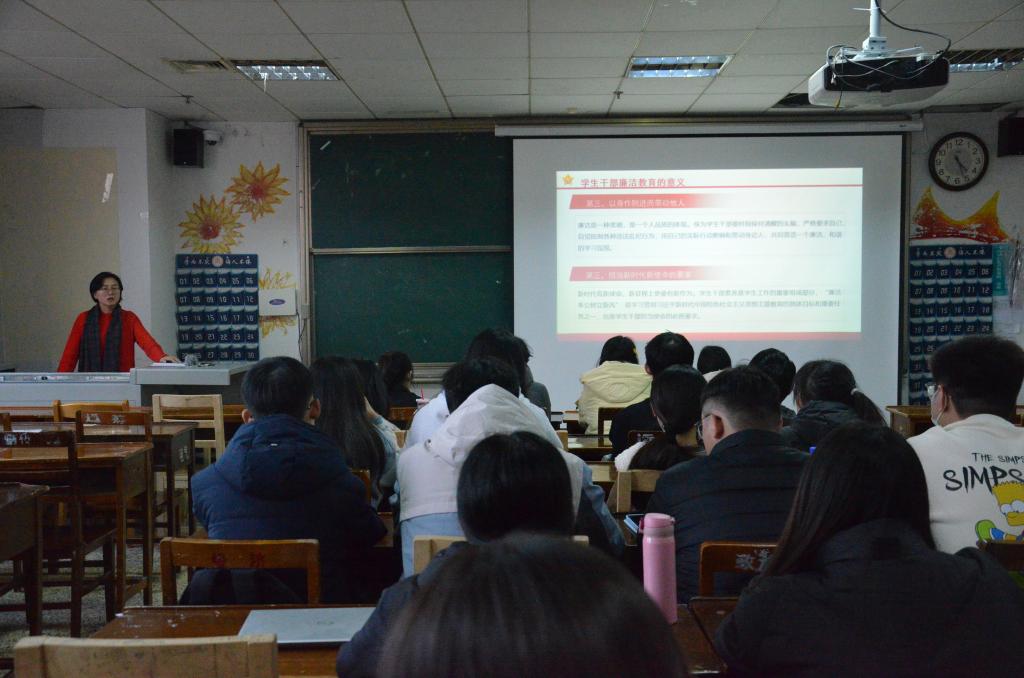 党委书记卢瑞霞在JC605为学院青马工程培训学员讲授“学好廉洁文化,做时代新人”廉洁思政课。
