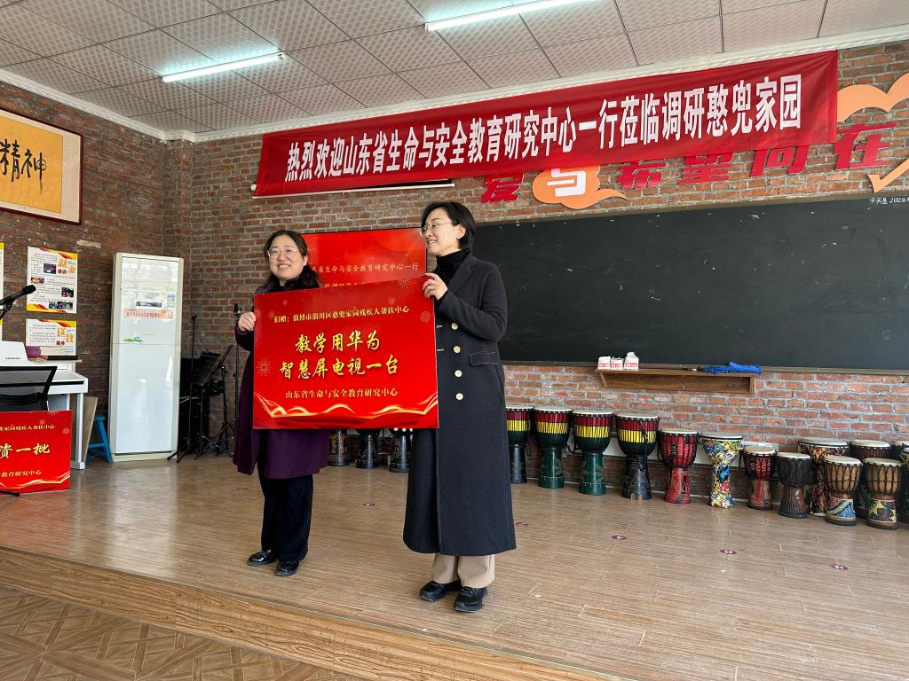 活动中卢瑞霞代表山东省生命与安全交研究中心向憨兜家园赠送教学用华为智慧屏电视一台。