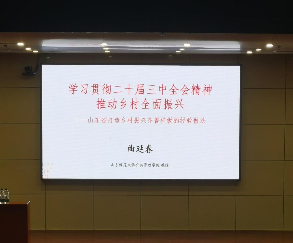 首先程香丽介绍了曲延春教授的学术研究领域和相关成果。随后曲延春教授根据党的二十届三中全会精神,结合个人大量调研案例,从乡村振兴战略政策梳理、乡村振兴战略提出的实践动因与理论依据、乡村振兴战略实施面临的突出问题以及推进乡村振兴战略的具体路径等方面讲解了为什么提出乡村振兴战略、如何实施乡村振兴战略、如何打造乡村振兴齐鲁样板等问题。讲座内容理论与实践相结合,既有理论高度,又有实践深度,为同学们送上了一场学术盛宴,对于增强同学们的理论认知和学术思考具有重要意义。