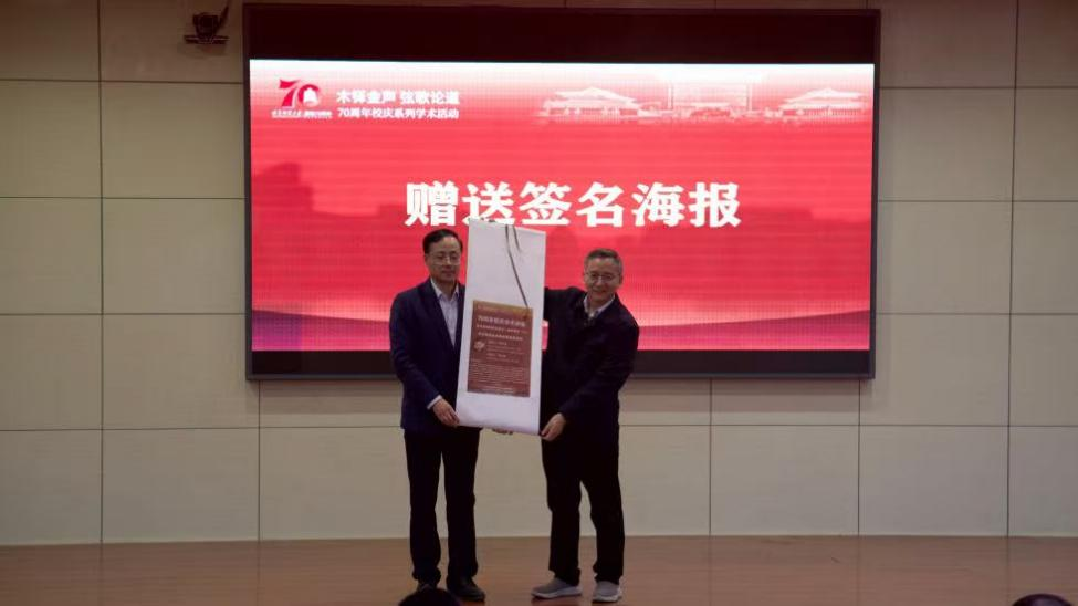 李增元代表学院向唐志超教授赠送海报纪念摆台,唐教授现场为讲座海报签名,该签名海报将作为51视频